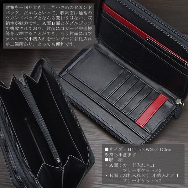 財布を一回り大きくした小さめのセカンドバッグ。だからといって、収納面は通常のセカンドバッグとなんら変わりはない、収納性が魅力です。A面B面とダブルジップで構成されており、片面にはカードや通帳等を収納することができ、もう片面にはファスナー式小銭入れをセンターにお札入れが二箇所あり、とっても便利です。プレゼントやギフトにもおすすめ。