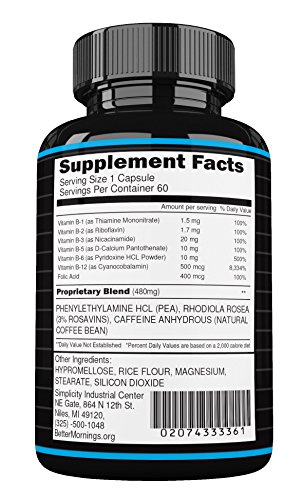 -. Binding : Health and Beauty -. Brand : P.R.Ime Labs -. Feature : Best brain supplement on the market for focus and energy to boost mood and enhance mental focus and clarity. / Unique natural formula better than regular caffeine pills, containing powerfully dosed B Vitamins, Phenylethylamine and Rhodiola. / Ideal for waking up, supplies energy when you need it while also providing enhanced mental focus, improved memory and mood with no jitters or crash. / Two month supply - Each Bottle contains 60 potent, energy boosting capsules and one capsule is one serving. / Satisfaction guaranteed! We offer a 30 day no questions asked refund policy becuase we stand by our products which are carefully crafted in the USA in an FDA registered facility. -. IsAdultProduct : 0 -. Label : P.R.Ime Labs -. Manufacturer : P.R.Ime Labs -. ProductGroup : Health and Beauty -. ProductTypeName : HEALTH_PERSONAL_CARE -. Publisher : P.R.Ime Labs -. Studio : P.R.Ime Labs -. Title : Best Energy Pills, Nootropic for Focus and Mood with B Vitamins, Caffeine, Rhodiola and Phenylethylamine, Clarity and Memory Booster, Study Aid, Vitamins for Energy - 60 Capsules