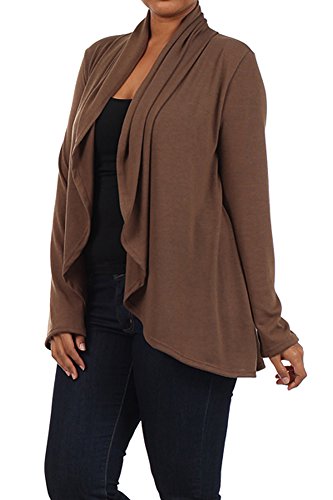 -. Binding : Apparel -. Brand : TheScoop Plus -. Department : womens -. Feature : Draped Waterfall Loose Knit Open Front Asymm Cardigan / Fits true to size, Flatters all body types / Made In USA / Fabric Content: Hacci (rayon/poly/spandex blend) / Machine wash cold, line/hang dry or tumble dry low. -. ProductGroup : Apparel -. ProductTypeName : SWEATER -. Title : Essential Plus Size Open Front Waterfall Cardigan Sweater for Women