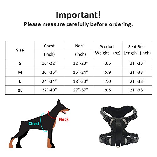 Size Chart: S: Chest Girth 16"-22", Neck Girth 12"-20" M: Chest Girth 20"-25", Neck Girth 16"-24" L: Chest Girth 24"-34", Neck Girth 18"-30" XL: Chest Girth 32"-40", Neck Girth 27"-37" Dog seat belt length: 21-33"