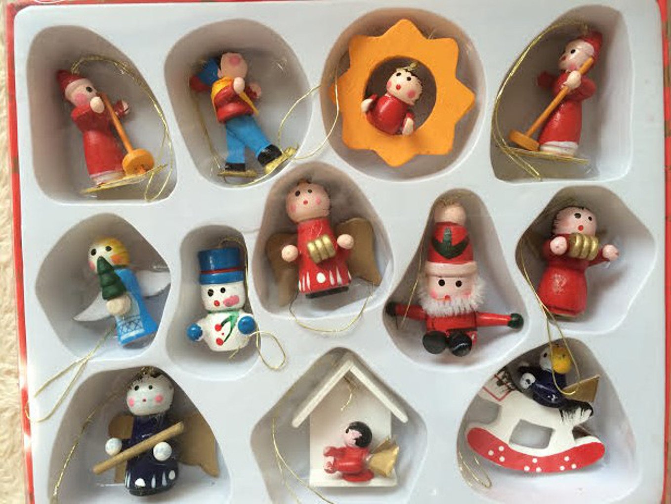 素材:木製 サイズ:1個2.5~3.7cm ケース:約16×14×1.8cm ひも付き※手作りですので人形の顔の表情など画像通りでない場合があります。ご了承下さい※ クリスマスまでサンタクロースのお面付き