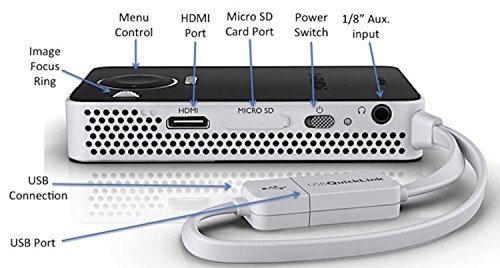 pocket projector, 50 lumens, up to 60" (150 cm) screen, 4 Oz, Wireless, Media player, battery up to 2 hours, HDMI, Bluetooth, 4 GB internal memory, Micro SD card reader, USB plug, USB charging,