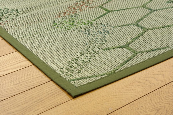 様々な色を使用した、華やかな亀甲柄い草カーペットです。い草には空気の自然浄化作用、湿度の調節作用などがあります。また汚れにくく、使用するうちに黄金色に変化し、味が出ます。い草に青森ヒバ加工を施しています。(抗菌・防臭効果)