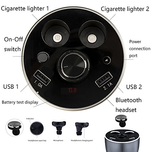 New Multifunctional Car Charger, AOZHUN 6 In 1 Car Charger, 2 USB Charging Ports, 2 Electric Cigarette Lighters, 1 Bluetooth 4.0 Headphone With Microphone, Car Safety Hammer on the Bottom.