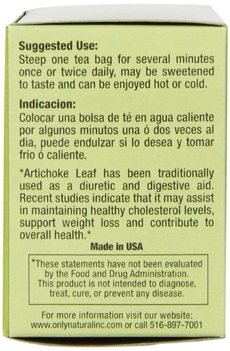 -. Binding : Health and Beauty -. Brand : Only Natural -. EAN : 0727413007197 -. Feature : May assist in maintaining healthy cholesterol levels / Supports weight loss / Contributes to overall health -. IsAdultProduct : 0 -. IsAutographed : 0 -. IsMemorabilia : 0 -. Label : Only Natural -. LegalDisclaimer : Actual product packaging and materials may contain more and different information than what is shown on our website. We recommend that you do not rely solely on the information presented and that you always read labels, warnings, and directions before using or consuming a product. Please see our full disclaimer below. -. Manufacturer : Only Natural -. Model : 719 -. MPN : 1086354 -. NumberOfItems : 1 -. PackageQuantity : 1 -. PartNumber : 1086354 -. ProductGroup : Health and Beauty -. ProductTypeName : HEALTH_PERSONAL_CARE -. PublicationDate : 2013-07-02 -. Publisher : Only Natural -. ReleaseDate : 2013-06-29 -. Size : 20 BAG -. Studio : Only Natural -. Title : Only Natural Diuretic Artichoke Tea, 20 Count -. UPC : 727413007197