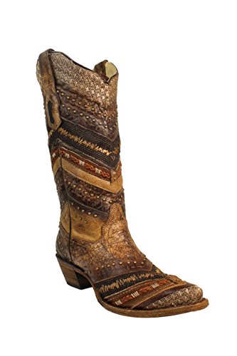 Studio : Corral Boot Publisher : Corral Boot Binding : Apparel Product Description Known for producing the most exquisite quality of boots, Corral Boots has built its name upon each handcrafted pair of footwear and other western products for both men and women. Take this Women's Brown Chevron Embroidery Studs boots made from high-quality leather. Its 13-inch shaft is designed with stud accents in chevron pattern detailing, a snip toe profile, and 2.25-inch cowboy heels for a badass and more striking look! It also features dual pull-on straps, scalloped top shaft, and rubber heel tabs for excellent comfort and stability all day long. With a broad range of style choices and high regard for western fashion, Corral is considered to be one of the premier boot manufacturers all over the world! Import. 0