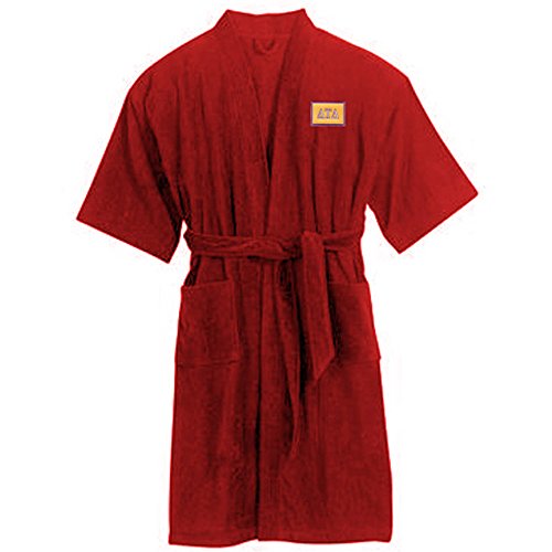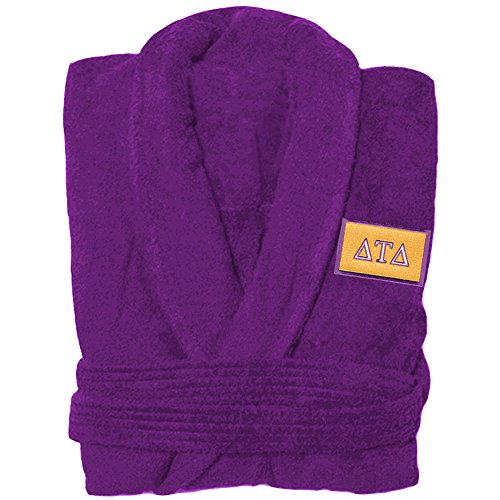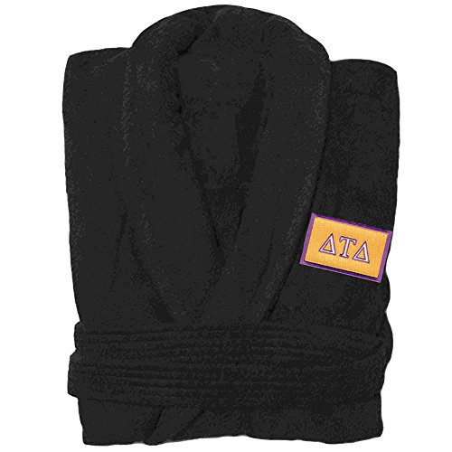 Binding : Apparel Product Description Delta Tau Delta Flag Patch Bathrobe. Fraternity Flag Emblem Bathrobe showcases your organization's Fraternity Flag. 12oz 100% Heavyweight cotton fraternity bathrobe with terry velour outside and looped cotton terry inside. Two belt loops, two patch pockets. 48" Mid calf length. Embroidered with your groups flag