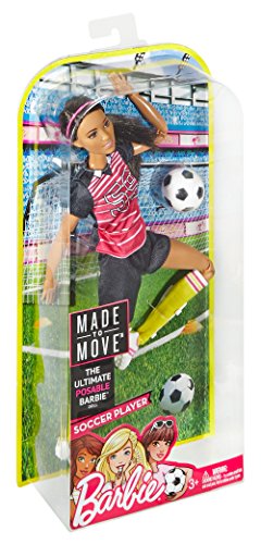 -. Feature : Get ready to compete with Barbie active sports dolls! / Barbie soccer player doll features extra flexibility for extra-cool moves -- 22 "joints" in the neck, upper arms, elbows, wrists, torso, hips, upper legs, knees AND ankles allow an incredibly realistic range of movement! / She's ready to head to the field in a soccer uniform with pink and white stripes on her numbered top, a matching number on her black shorts, striped shin guards, a black headband and white and pink sneakers / A soccer ball will help her score a goal! / Young sport lovers will find all kinds of stories to play out and all types of moves to make with Barbie soccer player doll