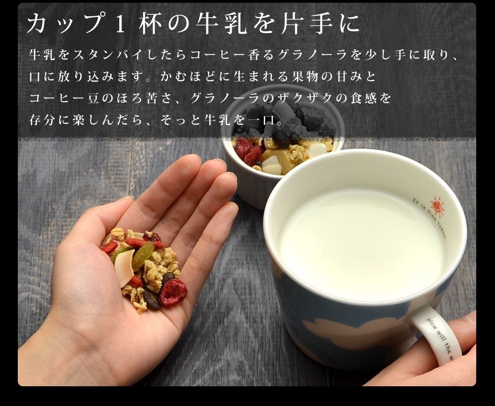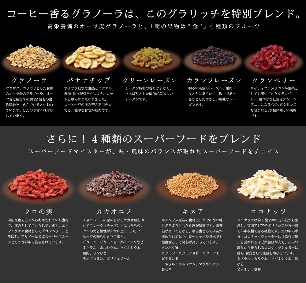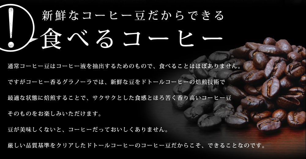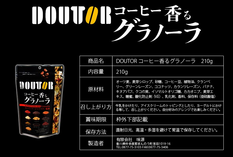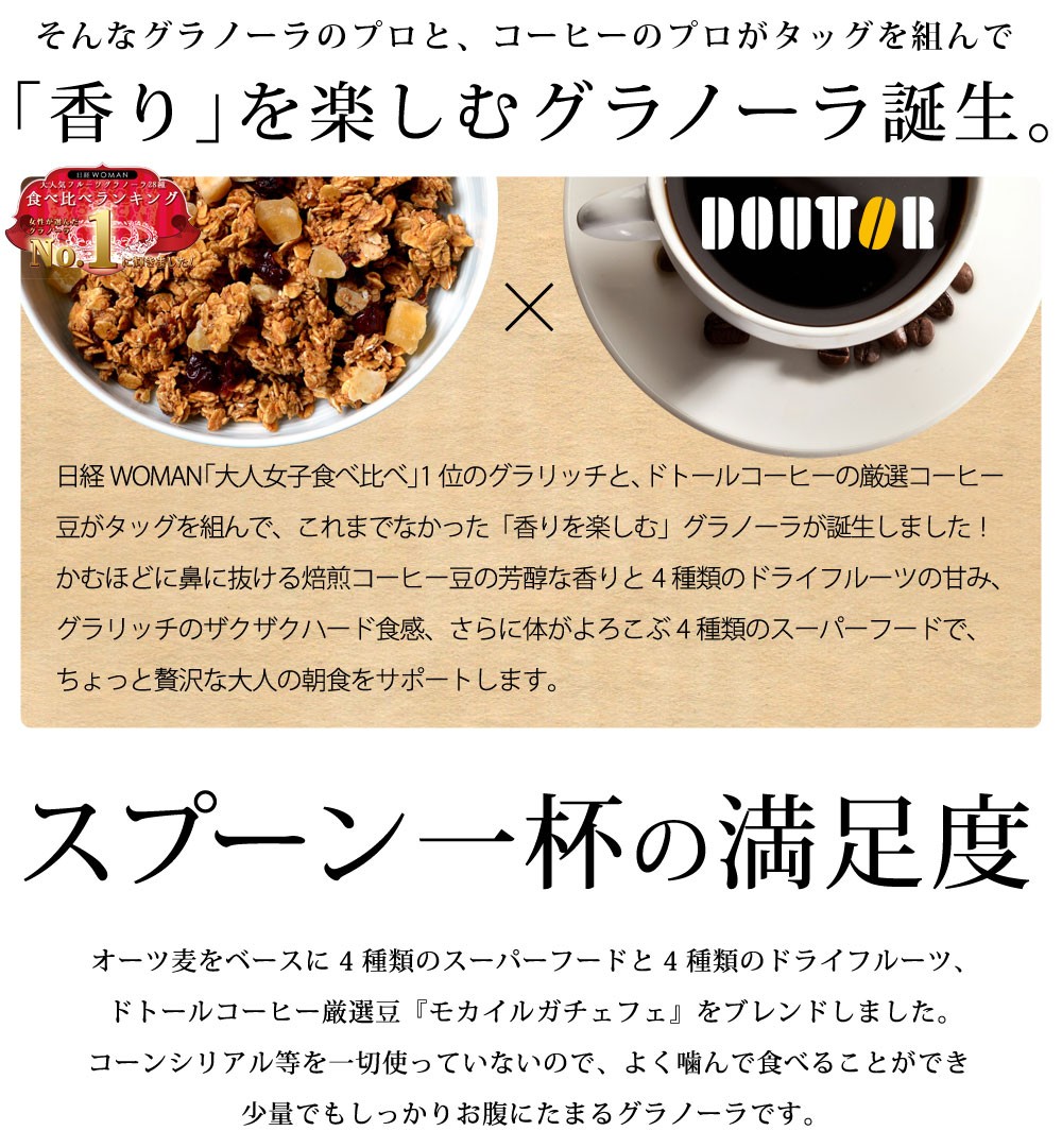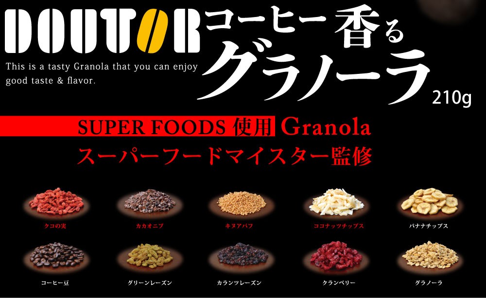 スーパーフードマイスター監修、噛むほど広がるコーヒー豆の風味《ドトール コーヒー香るグラノーラ 210g》●スープん一杯の満足度、少量でもしっかりお腹にたまる●ドトールコーヒー厳選のコーヒー豆●4種類のスーパーフード●4種類のフルーツ