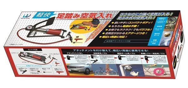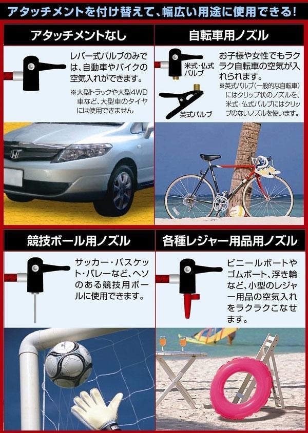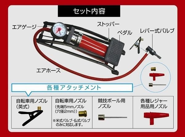 | 足で軽く踏むだけで空気入れができるので女性でも楽々。付属のアタッチメントを使えば、自転車&ボール&レジャー用品&バイク&車の空気入れも可能。空気圧が一目でわかるエアゲージ付き。もちろん電源不要なので経済的です♪ |