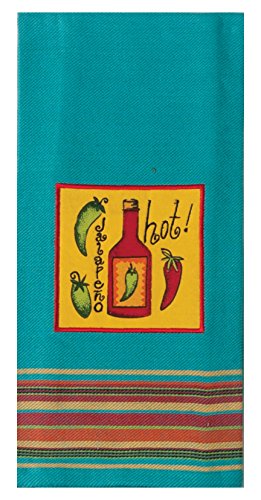 - Blue tea towel features tabasco and jalapeno applique with embroidery detail
