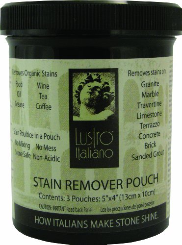 Studio : Tenax USA Publisher : Tenax USA Binding : Kitchen Product Description Lustro Italiano Stain Remover Poultice Pouch contains stone-safe surfactants and diatomaceious earth to remove stains out of stone. By utilizing the stain process reversal technique, Lustro Italiano Poultice Pouch draws the stain out of the stone. Designed to remove stains such as oil, grease, wine, tea, coffee, and other organic stains out of granite, marble, travertine, limestone, terrazzo, concrete, brick, etc. Simplyrun the Lustro Italiano Pouch under water to saturate the Pouch. Apply the Pouch over the stain. Cover with plastic wrap and make several toothpick holes in the plastic wrap. Within 24-48 hours after the powder has dried, remove the poultice and the stain will be gone! 3 pouches per container. Each pouch is 4-inch by 5-inch. For larger stains use multiple pouches or use the Lustro Italiano Poultice Powder. 0