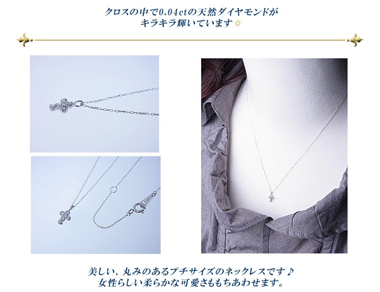 商品説明 ホワイトゴールドの美しい丸みのあるプチサイズのクロスダイヤモンドネックレスです。