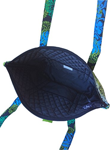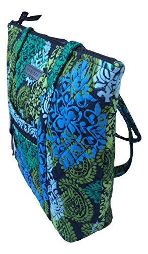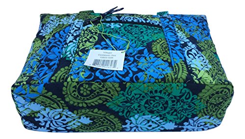 Vera Bradley's durable and spacious Villager Tote is made of soft quilted fabric with a removable sturdy fabric covered bottom insert. The fully zippered top closure reveals a lined interior featuring 6 open slip pockets. This series has been updated with coordinating solid quilted solid interiors. The front offers a small zippered pocket and the dual straps have a very comfortable drop of about 10.5 inches. The Villager is versatile and makes for a great, every day tote - whether for school, work, the beach, or the gym. It makes a great carry-on bag for travel, or even a compact beach bag! It is lightweight, and easily maintained. Just remove the sturdy fabric covered insert and it can be placed in the wash. It measures 13 inches long x 13 inches high x 4 inches wide. The Villager is smaller than the Vera Tote, and slightly larger than the Tote. Machine wash cold, gentle cycle, only non-chlorine bleach as needed, line dry. Patterns with solid color interiors are designed and produced for Vera Bradley Outlet stores.Feature
