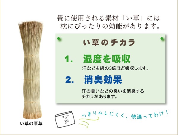 熊本県の八代と福岡県の筑後地方産の無染土い草を使用しています。い草には(1)空気の清浄(二酸化窒素、ホルムアルデヒドを吸着)(2)湿度の調整(3)消臭作用(4)綿の3倍の吸湿率などの効能があります。い草に青森ひば加工を施しています。(抗菌、防臭効果)リバーシブルタイプでい草チップ側、ポリエステルわた側の2種類の触感を楽しめます。※中材の出し入れはできません。