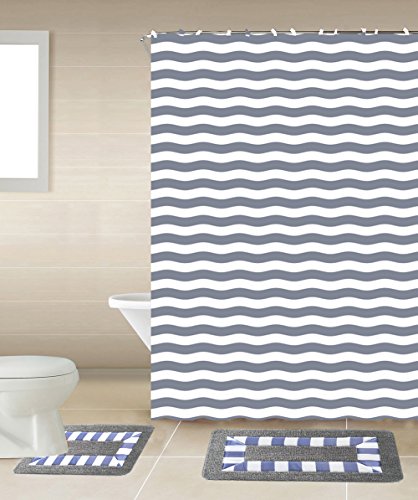 -. Feature : Striped Designer 15-Piece Bathroom Set / 1-Fabric Shower Curtain (72" x 72"), and 12-Matching Fabric Covered Shower Rings / 2 Bath rugs: 1-18" x 29.5" (46cm x 75cm) Bath Mat, 1-18" x 18" (46cm x 46cm) Contour Rug / Soft Bath Mats have a durable Rubber Anti-slip backing / Easy Care, Machine Washable