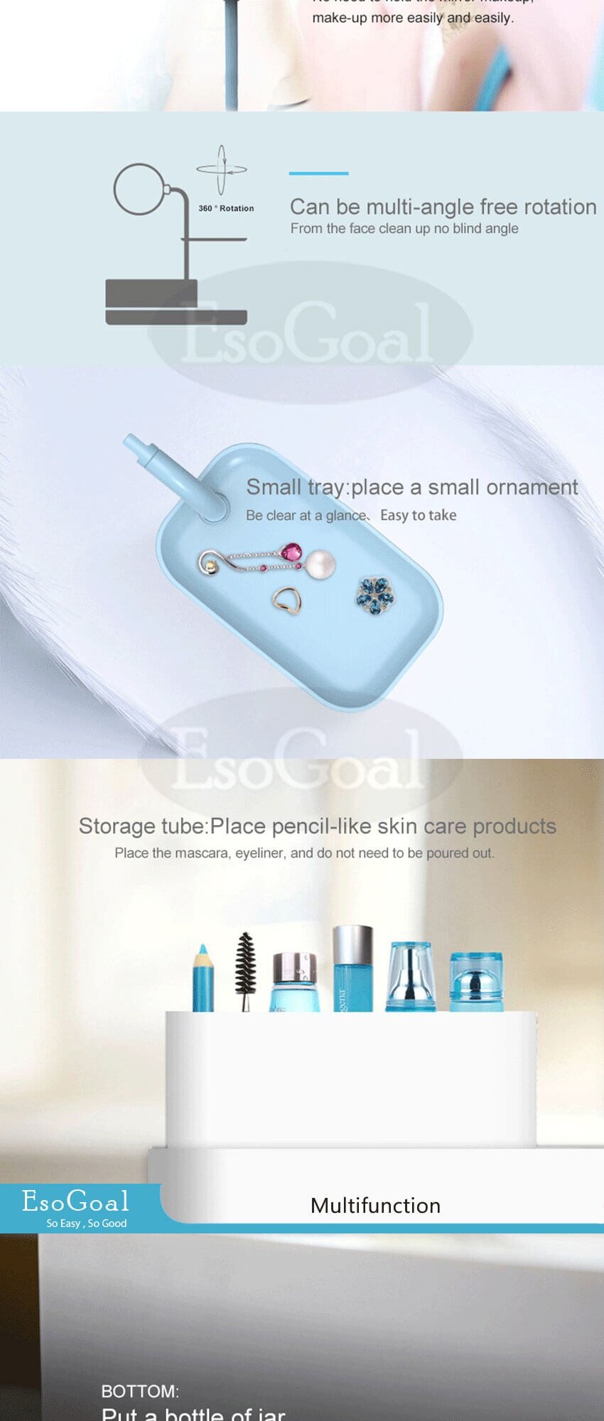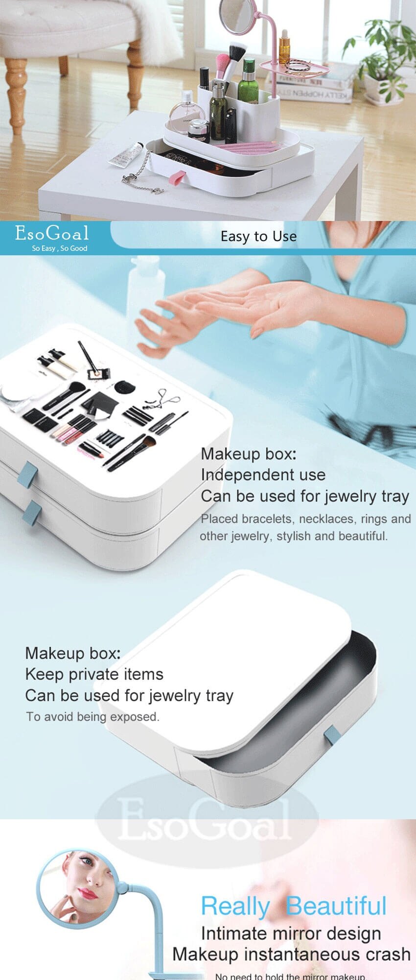• 360 degree rotating makeup mirror, can makeup easily; removable brown mesh padding keeps jewelry protected.