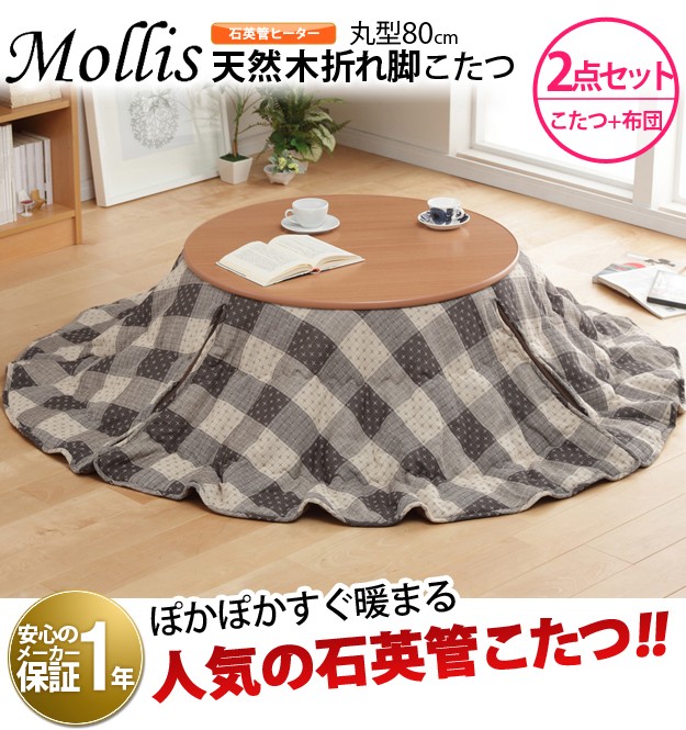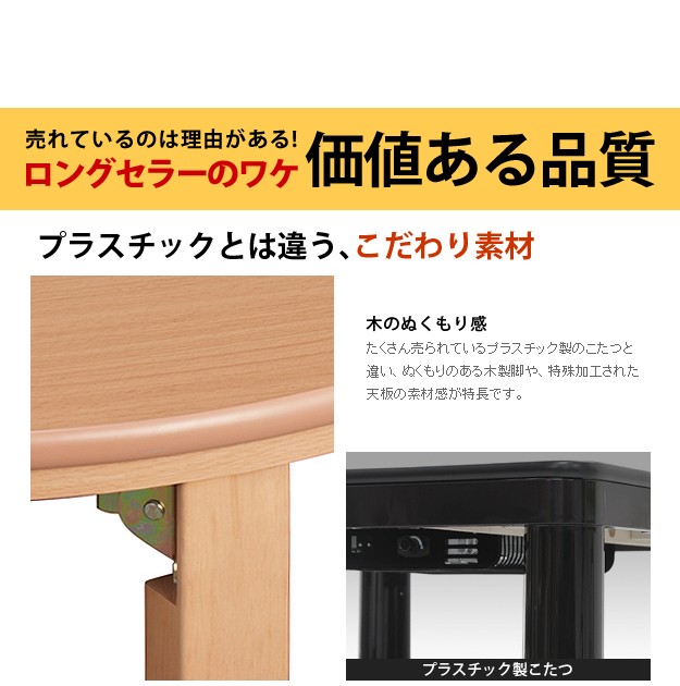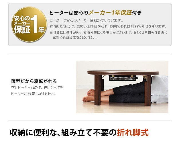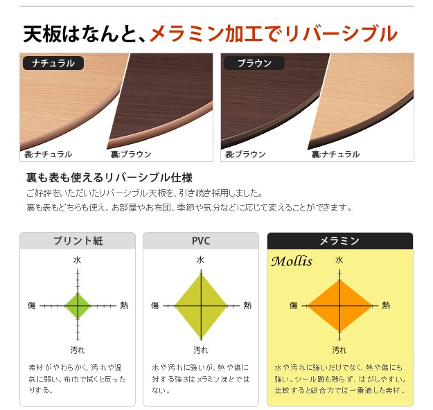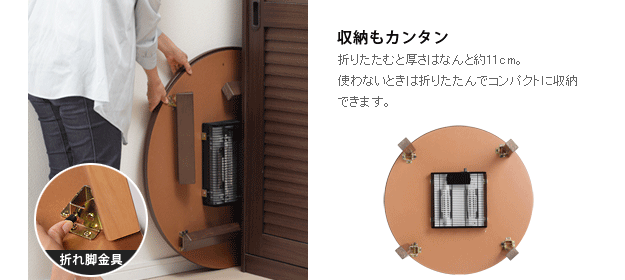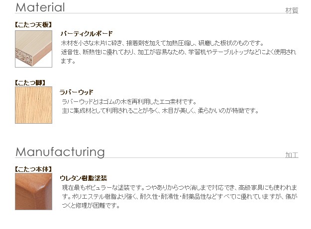 商品について:木製こたつ+省スペース布団の2点セット。天板は表も裏も使えるリバーシブル仕様。メラミン加工を施しているので、水や汚れに強いだけでなく、熱や傷にも強いのが特徴です。折りたたむと厚さ約11cm。使わない時はコンパクトに収納できます。