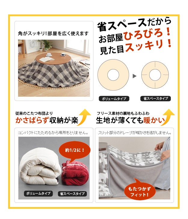 こたつ布団はスリットを入れて全体のもたつきを解消した省スペースタイプ。圧迫感のないスッキリとした印象☆裏地とコーナー部分は保温性の高いフリース素材です。