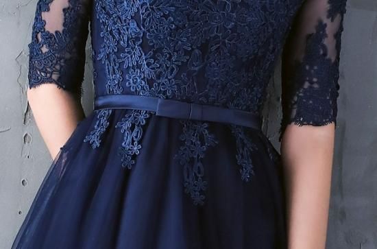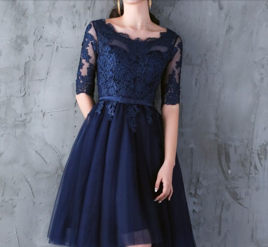 繊細なレースワークが美しい、ひざ丈パーティードレス。