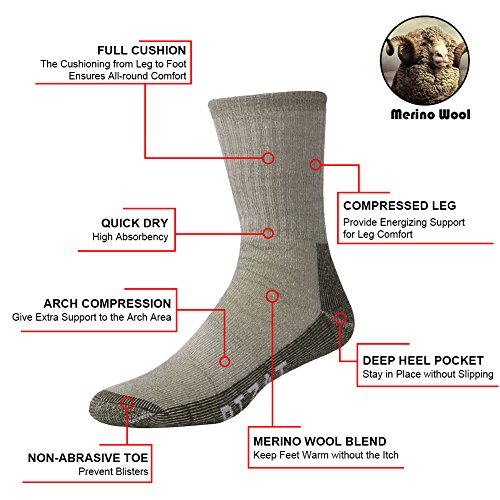 -. Binding : Apparel -. Brand : RTZAT -. Department : mens -. Feature : PERFORMANCE: Antibacterial silver ions in the yarn to keep feet clean, dry, and odor-free. Moisture-wicking, temperature regulating, smooth toe construction, arch compression, longwearing, no itch, superior strength and durability, soft, thick, cushioned throughout for all day comfort. / BEST OUTDOOR SOCKS IN THE WINTER: Our socks work great with casual, snow, hunting, hiking boots & shoes. It's absolutely the best choice when you are going camping, hiking, trekking, hunting, climbing and mountaineering in cold weather. / BEST INDOOR SOCKS IN THE WINTER: Our merino wool socks are full cushioned with soft wool blend terry, which makes them super comfy and ultra warm. These socks are great to wear in bed and around the house to stay warm through the cold winter nights. / 4 COLORS: Blue, purple, light grey, auqamarin(please see photo). There are also 1 pack, 2 pack, 4 pack available for your choice. Unisex wool socks fit for couples, adults, teens, youths, outdoor sports lovers. / SIZE: One size fits shoe size men/boys 8-13 women/girls 9-13. -. IsAdultProduct : 0 -. ProductGroup : Apparel -. ProductTypeName : SOCKSHOSIERY -. Title : Merino Wool Hiking Socks, RTZAT Unisex Silver Antimicrobial Winter Thermal, 1/2/4 Pairs