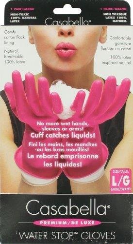 -. Feature : One pair of size medium waterstop rubber gloves by casabella / Latex with cotton flocked lining / Patented design with extra-long cuffs that turn up to catch drips and help keep inside of gloves dry / Non-slip textured surface provides a safe grip / Lipstick pink for cleaning in style