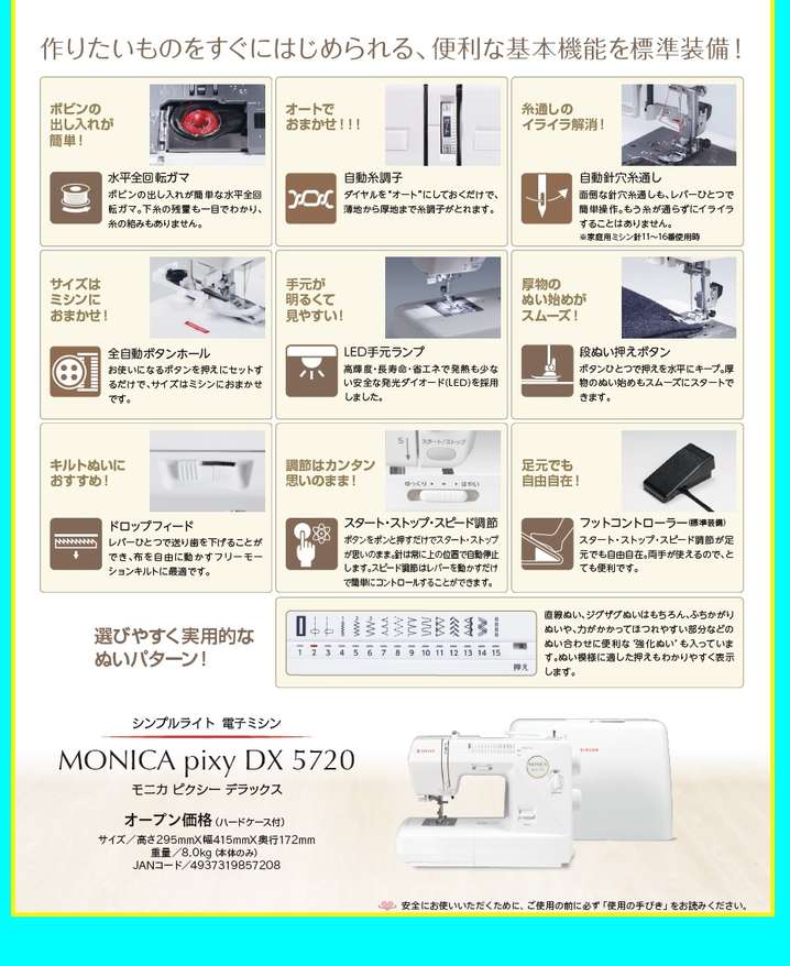●ぬい始めにボタンを押すだけで、押えが水平に保持されるので厚物のぬいもスムーズにスタートできます。