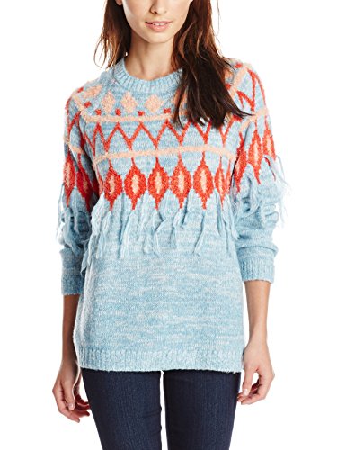 Pullover crew-neck sweater featuring geometric placement print with fringe trim