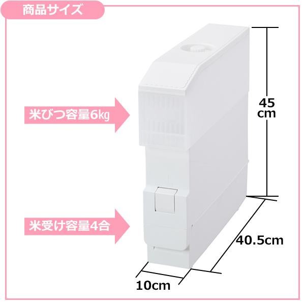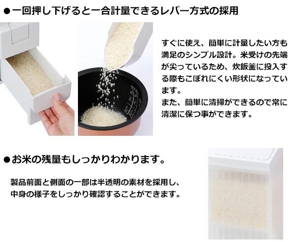 | 仕様 | 米びつ容量:白米6kg 米受け容量:白米4合 計量装置:レバー方式(1合・1レバー式) 米投入口サイズ:巾7.3×奥行36cm キャスター数:後ろ側2個 異物混入防止構造 |