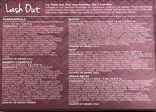 Sephora Favorites inside JCP set. 5 Mini mascaras ONLY. This set does NOT include a voucher for a full size mascara. Includes Minis in the following mascara styles: Buxom Lash, Benefit Roller Lash, BareMinerals Lash Domination, UD Perversion and Tarte Lights Camera Action Lashes. All mini travel size.Feature