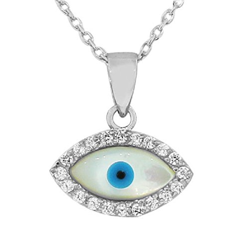 -. Feature : Length (inches):18 / White CZ Simulated Mother-of-Pearl Evil Eye Hamsa Pendant Necklace The Jewelry Is Hot! The pendant showcases a gorgeous delicate Evil Eye charm pendant sparkling with white round crystal stones shining with the mother of pearl insert and set onto a delicate link chain. The Evil Eye charm on this pendant is believed to protect the wearer from bad luck. The necklace is crafted of sterling silver. This beautiful jewelry will make a wonderful gift for a lady.