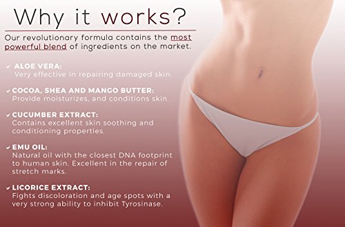 SMELLS GREAT: This anti-stretch mark and scarring cream is made from natural oils and herb extracts including licorice, bearberry, emu oil, aloe vera, cucumber, cocoa, shea, and mango butter, which not only work on repairing damaged skin cells, but also produce a mild mixture of herbal scents that lets you enjoy every application.