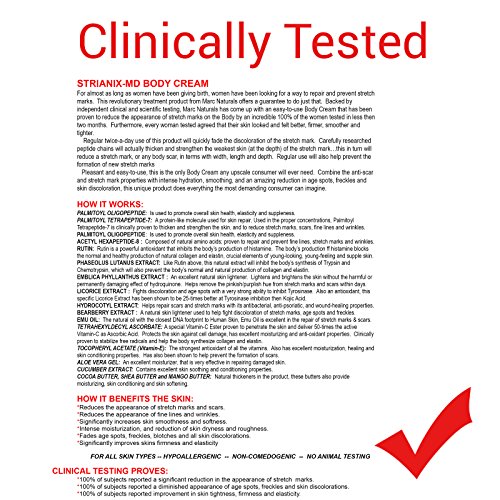 CLINICALLY PROVEN TO REDUCE THE APPEARANCE OF STRETCH MARKS: The Marc Naturals: Intensive Stretch Mark Complex has a formulation that's been clinically tested and proven to improve the appearance of stretch marks before & after pregnancy, freckles, age spots, and skin discoloration. 100% of subjects in the clinical testing done at AMA Laboratories in New York reported an overall improvement in skin appearance, firmness, elasticity, and health.