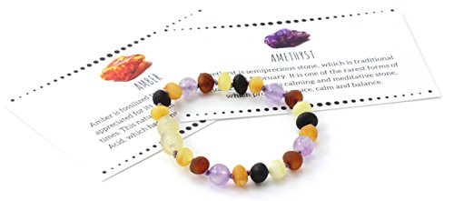 Unpolished Baltic Amber Teething Bracelet / Anklet made with Amethyst Beads - Size 5.5 inches (14 cm) - Raw Multicolor Amber Beads - BoutiqueAmber (5.5 inches, Raw Multi / Amethyst)