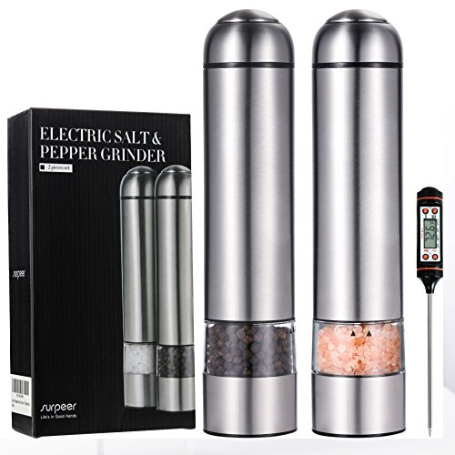 Salt and Pepper Shakers, SURPEER Electric Adjustable Pepper Grinder with Strong Battery Powered - Ceramic Grinder Core - Automatic Led Light - Easy to Use - Meat Thermometer Included - 2 Pieces Set