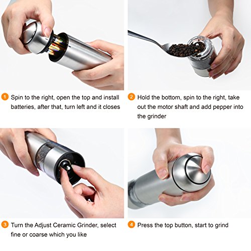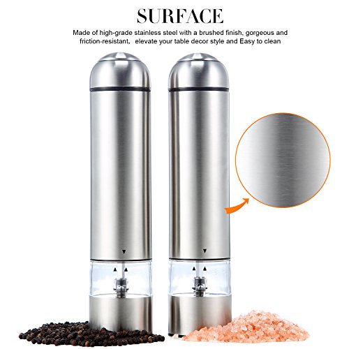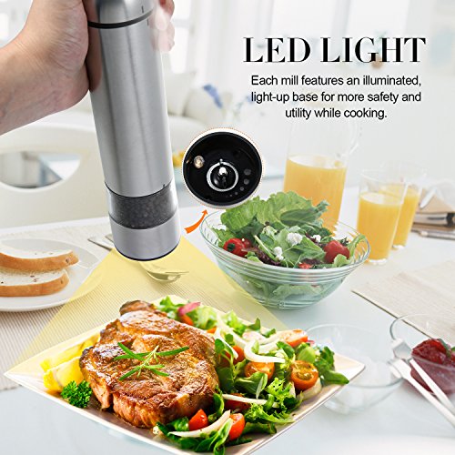 - 【Powered & Light】 - Powered by 6 x AAA batteries each (included), this grinder can grind salt and pepper automatically, quickly and efficiently. It can easily grind theWhite rock slat, the hardest salt in the world. Each mill features an illuminated, light-up base for more safety and utility while cooking.