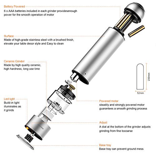 - 【Artistic Metalic Design】 - Made from a high-quality, durable stainless steel,the grinder is sleek and classic inlook. This stunningdesign is portable and friction-resistant, easy to carry anywhere. Activated with the simple push of a button, this mills are easy and comfortable to use by onehand.
