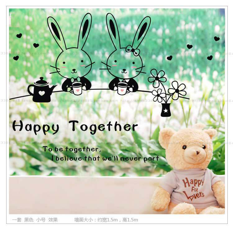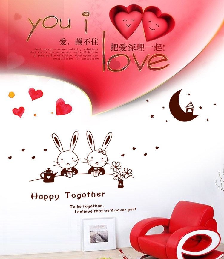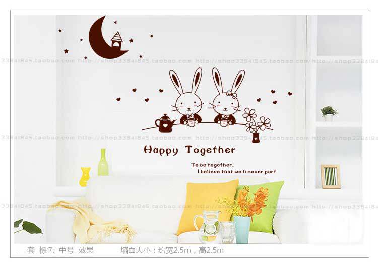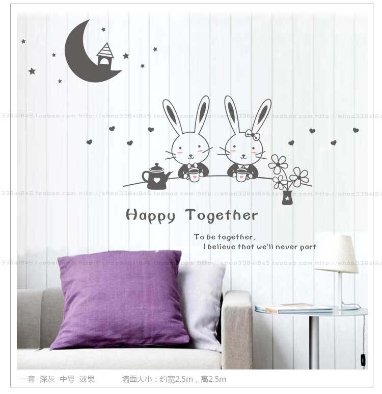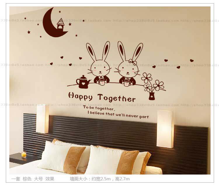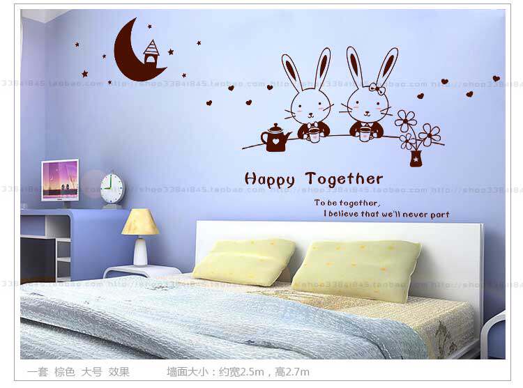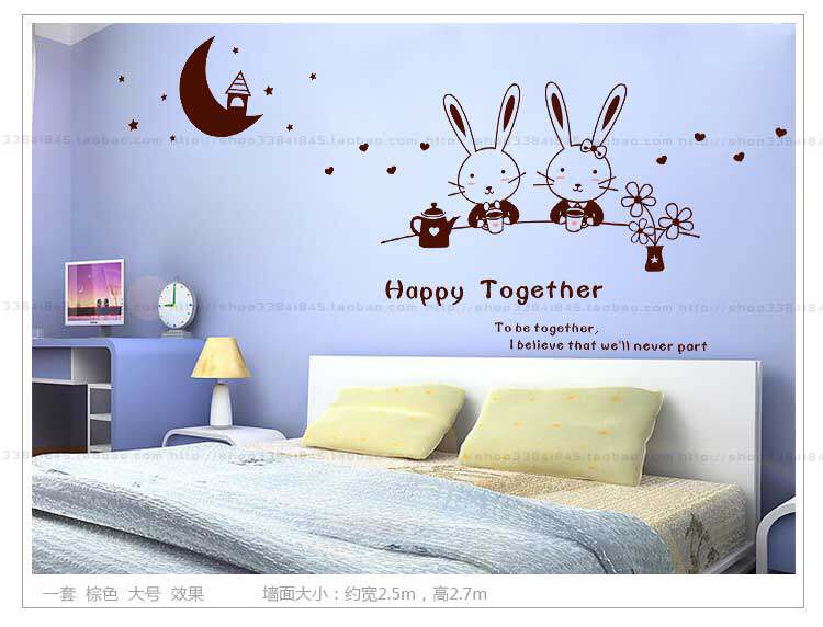 卡通可爱墙贴 卧室浪漫儿童房床头背景墙贴纸贴画 两只小兔