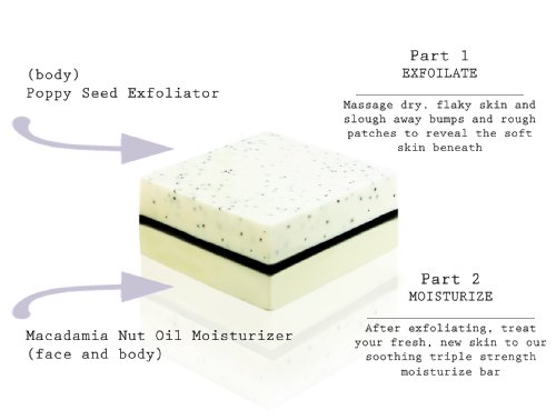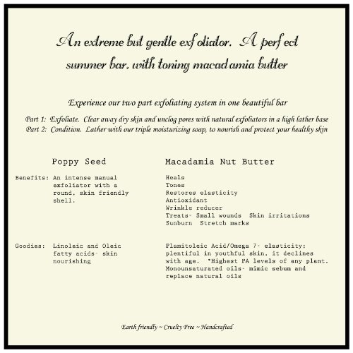 -. Feature : "Two in One" soap is one-half moisturizing and skin tightening macadamia nut butter and one-half exfoliating poppy seed bar / An intense, but gentle exfoliator. The perfect sP.R.Ing and summer bar, with toning macadamia nut butter. / Every luxurious exfoliation bar is hand poured and separated into two parts by a black, antioxidant rich, vitamin E strip / A Level 3 exfoliator paired with a triple moisturizer, butter bar. The poppyseed and macadamia nut oil bar gives a buttery twist to a popular exfoliator / Massage away dry, flaky skin and clogged hair follicles with the poppy seed half. Then, treat your new skin to a nourishing, toning bath of macadamia nut butter. With its exfoliating, healing and toning properties, the Poppyseed and Macadamia Nut Oil is a great everyday exfoliator.