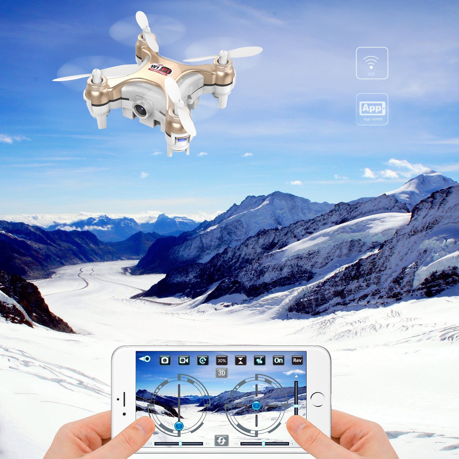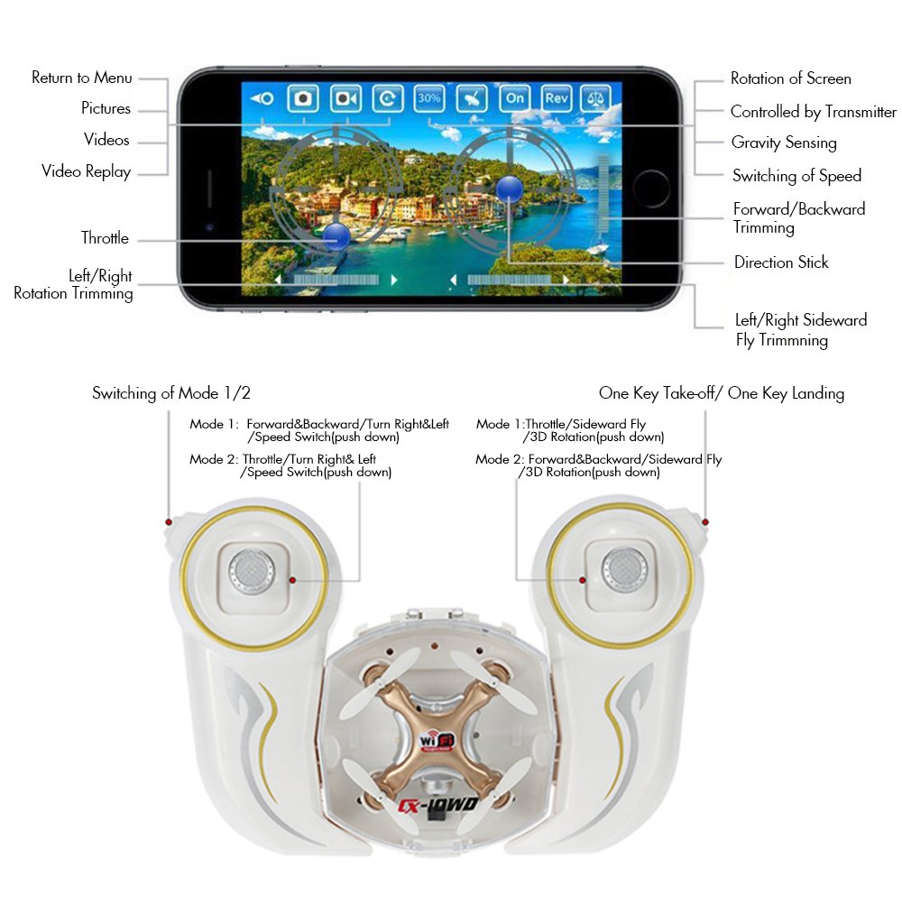 Function: wifi wireless LAN control / one key takeoff / one key landing / altitude maintenance / three speed modes