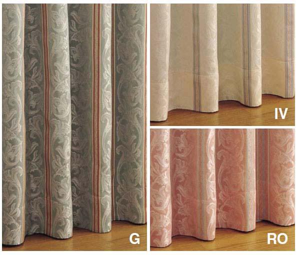 | 仕様 | ウォッシャブル、遮光2級、裏地付 寸法変化率:水洗い・タテ=-1%、ヨコ=-1%(JIS L 1096 G法による) 遮光率:BE、G/2級(99.98%) アジャスターフック使用 柄合わせあり Aフック |