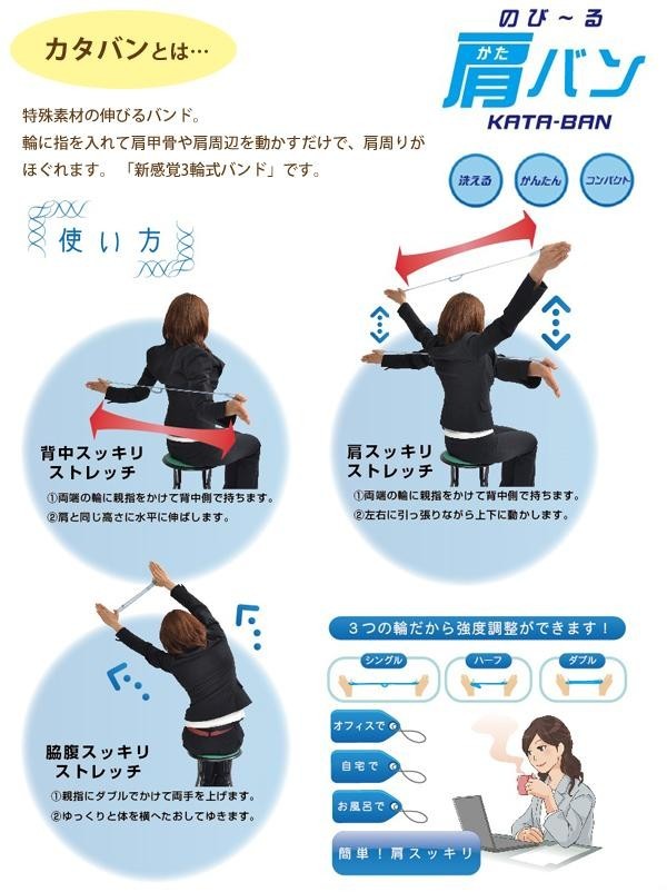 | モビベルとは、ドローインという「腹を凹ませる」という動きを学習できるベルトです。ドローインとは運動療法やスポーツ選手のトレーニングに取り入れられている技術の一つで、腹を凹ませることで主に腹横筋に働きかける方法です。カタバンは特殊素材の伸びるバンド。輪に指を入れて肩甲骨や肩周辺を動かすだけで肩周りがほぐれます。 |