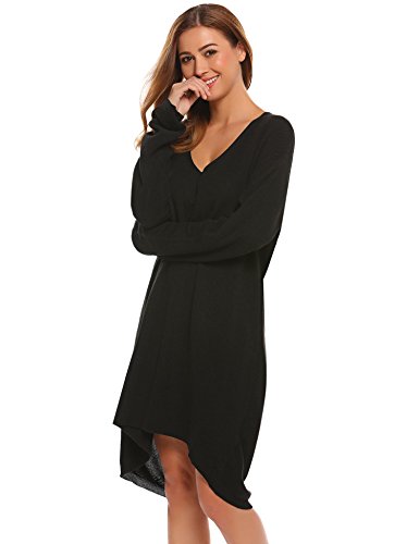 Elesol Women Sweater Dress Sexy Deep V Neck Long Sleeve High Low Hem Black/XL