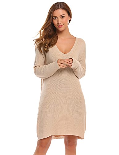 Elesol Women Fashion High Low Hem Sweater Dress V Neck Long Sleeve Knit Dress Camel/S