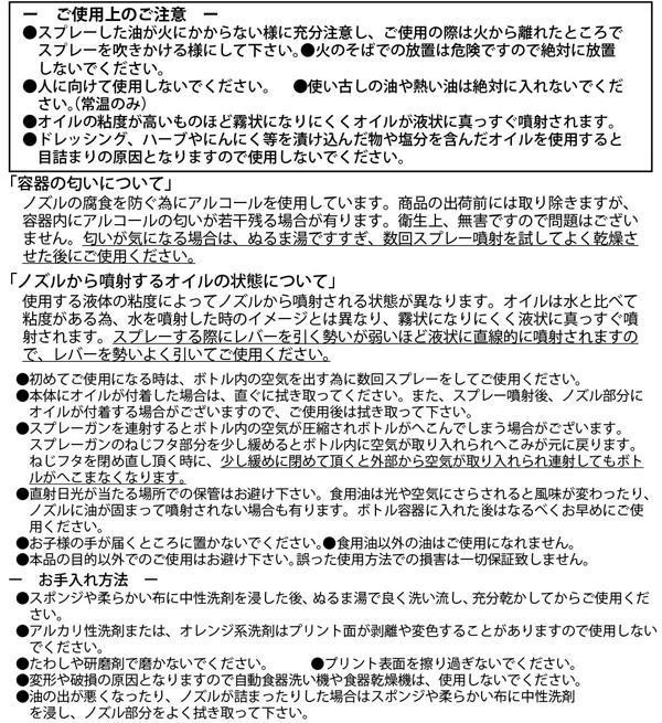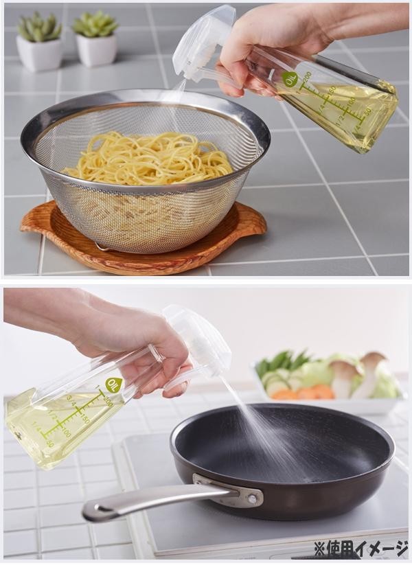 スプレータイプなので、まんべんなくかけることができます。茹でパスタのくっつき防止やフライパンの炒め物などに。少ないオイルで炒め物やオーブン料理が作れます。 |