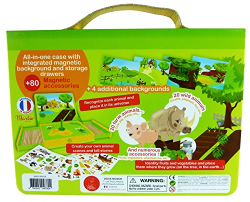 -. Feature : All-in-one case with integrated magnetic background, storage drawers and carrying handle + 4 additional magnetic backgrounds / Educational game : Recognize each animal and place it in its universe (farm od jungle), Identify fruits and vegetables and place them where they grow / More than 80 accessoires : Farm Animals, wild animals, Farming tools, fruits & vegetables. / For the youngest, enhances fine motor skills and coordination. For the oldest, stimulate the imagination and creativity, tell stories. / For both boys and girls ! Great gift idea as a toy from 3 years old. Perfect for travel (car or train)