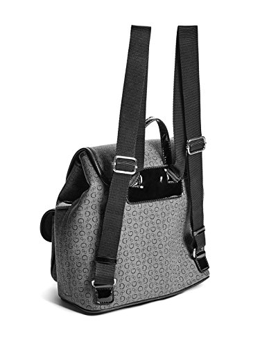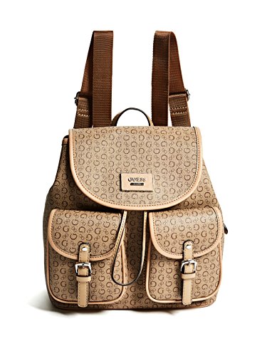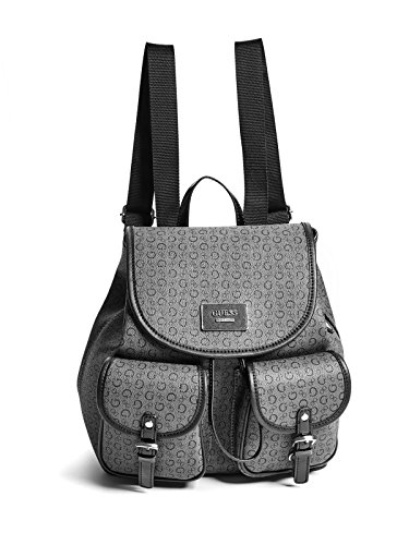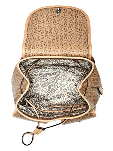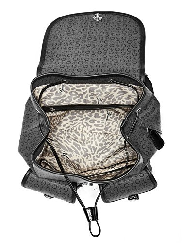 Studio : GuessFactory Publisher : GuessFactory Product Description An allover logo print covers this faux-leather backpack, detailed with contrasting patent accents. Drawstring closure opens to leopard-print lining with multipurpose pockets. Two exterior flap pockets at front. 0