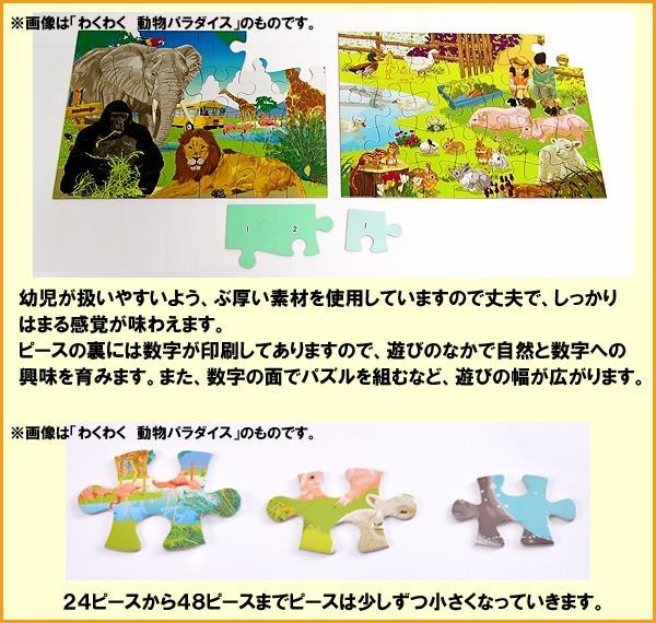 | 遊びながら学習につながる集中力と作業力を伸ばす、「スモールステップ」方式のジグソーパズルのセット。このSTEP3は、24ピースのパズルから48ピースのパズルまで、合計3枚のジグソーパズルがセットされています。少しずつピースを増やしていくことで、パズルを完成させる達成感を味わいながら、集中力と作業力を高めていけます。 |