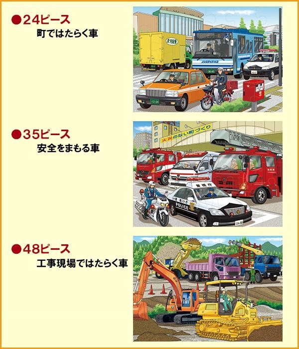 | はたらく車を、かつやくしている場面ごとに集めたパズル。 |