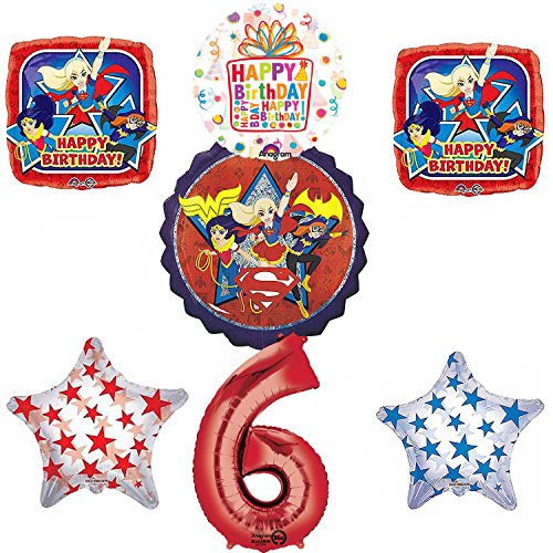 -. Feature : (1) 28 inch DC Super Hero Girls Round Holographic Foil Balloon / (1) 34 inch Giant Red Number 6 Foil Balloon / (2) 17 inch Happy Birthday Square DC Super Hero Girls Foil Balloons / (1) 26 inch See-Thur Birthday Present Balloon / (2) 22 inch Clear Stars 1- red and 1- blue